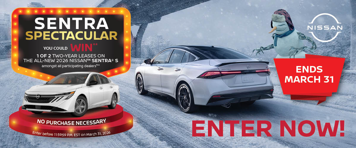 **NO PURCHASE NECESSARY. Subject to Official Rules at https://sentra.nissangiveaway.ca/official-rules, including the list of participating Ontario dealers. Contest closes at 11:59:59 P.M. EST on March 31, 2026. Open to legal Canadian residents who reside in the province of Ontario and are of the age of majority at time of entry. To enter, scan QR Code or enter the website domain found in this Contest advertisement and complete the entry form. There is a limit one (1) entry per person during the Contest Period regardless of how many advertisements you may see or participating dealerships that are near your home location. Two (2) prizes are available to be won amongst all participating NISSANTM Ontario dealers, consisting of a two (2) year lease of a 2026 NISSANTM Sentra® S vehicle with a total of 32,000km during the lease term. The approximate retail value of each Prize including applicable taxes on the vehicle, provincial sales tax; freights, AC tax, OMVIC Fee, tire tax; environment fee, administration fees including pre-delivery inspection charges is $11,412.00 CAD. Odds of winning a Prize depends on the total number of eligible entries received amongst all participating NISSANTM dealers in Ontario on or before the Contest Closing Date. Random draw held on April 13, 2026. Each selected entrant must correctly answer a mathematical skill-testing question and complete a Declaration of Compliance / Release of Liability and Consent to Publicity Form.